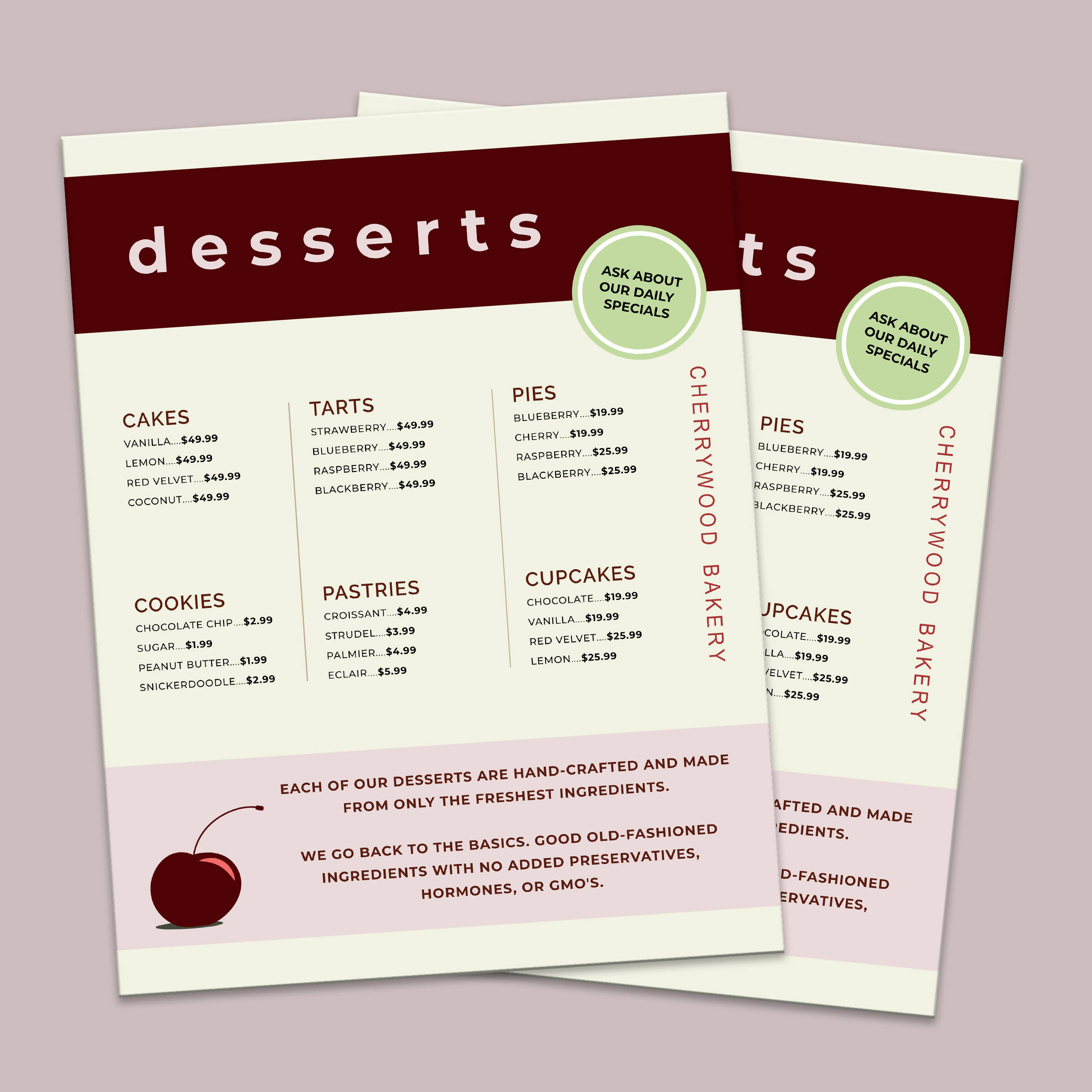 Cherrywood Bakery is all about going back to the basics and using good old-fashioned ingredients and processes. I wanted to incorporate elements that gave a nod to the bakery’s name, so the logo I crafted included a cherry and a rolling pin.